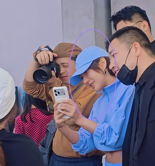 见的她穿着一身蓝色套装,而且上衣露着肚脐,小腹平平且有些许的马甲线,想来其日常坚持锻炼身体。