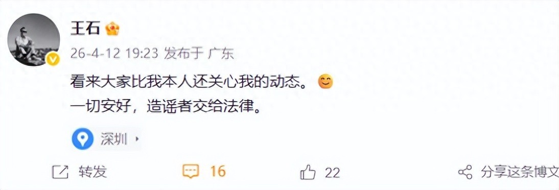 万科集团创始人兼董事会名誉主席王石4月12日晚发布微博:看来大家比我本人还关心我的动态。一切安好,造谣者交给法律。