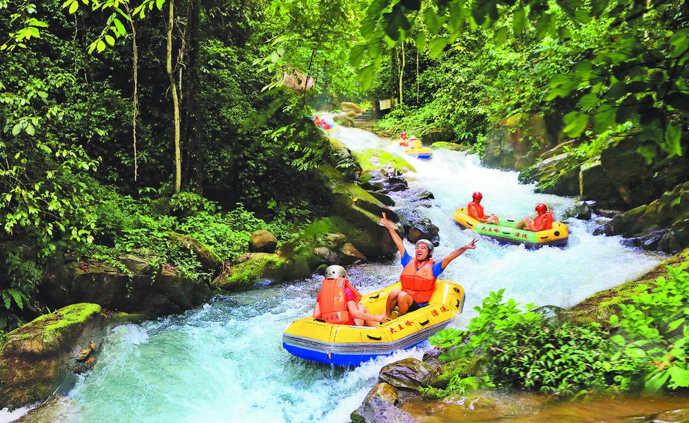 行程的起点,藏在大王岭的葱郁深处。大王岭漂流河道全程5公里,起终点落差高达126米,两岸是遮天蔽日的亚热带雨林,古木参天,藤蔓缠绕。乘上皮筏艇,随湍急的水流穿峡谷、越险滩,耳畔是鸟鸣与水声的交响,伸手可触的是带着草木清香的凉风——这是属于勇者的“湿身”狂欢,更是闯入原始秘境的沉浸式体验。